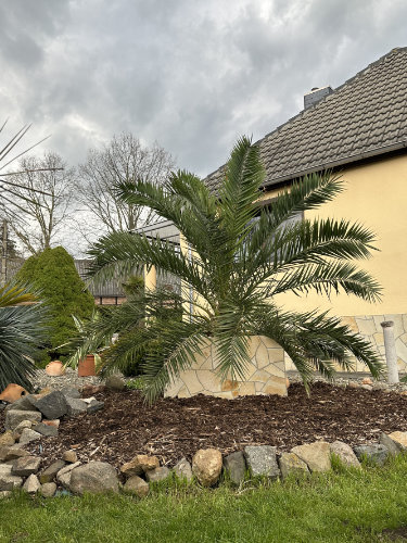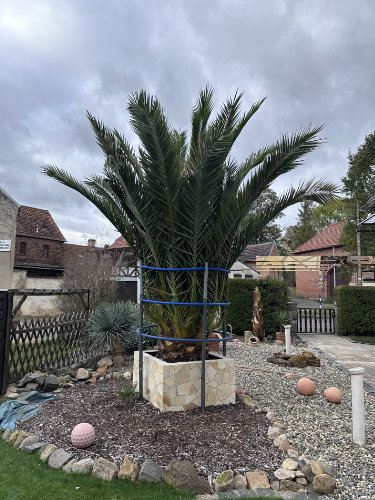 Unsere Palmenreise begann mit einer Phoenix-Palme, die zunächst als Blickfang im Wohnzimmer stand. Später zog sie in einen Topf nach draußen und seit 2021 ist sie ausgepflanzt – inzwischen ist sie die größte im Garten. Danach folgten eine Zwergpalme, eine Washingtonia, eine kleine Trachycarpus, eine Yucca rostrata sowie zwei große Trachys, von denen allerdings eine den ersten Winter nicht überstanden hat.