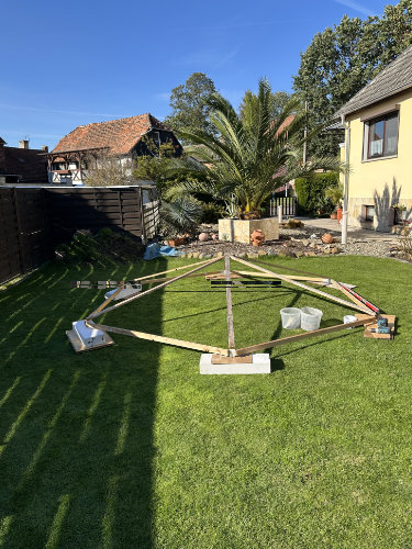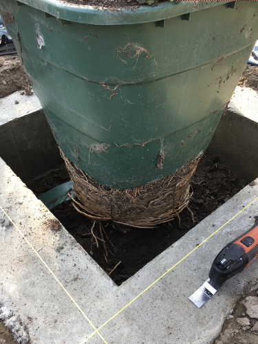 Da diese Lösung optisch auf Dauer nicht zufriedenstellend war, habt ihr den Standort später durch einen gemauerten und deutlich stabileren Kübel ersetzt. Dieser bietet nicht nur mehr Sicherheit, sondern fügt sich auch optisch viel harmonischer in den Garten ein.