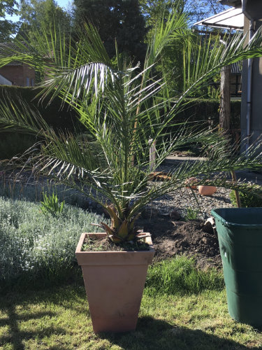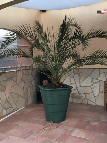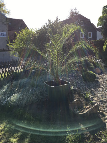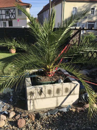 Besonders herausfordernd war eure inzwischen sehr große Phoenix-Palme. Anfangs stand sie in einer halb eingegrabenen Regentonne, damit der Wind sie nicht umwerfen konnte.